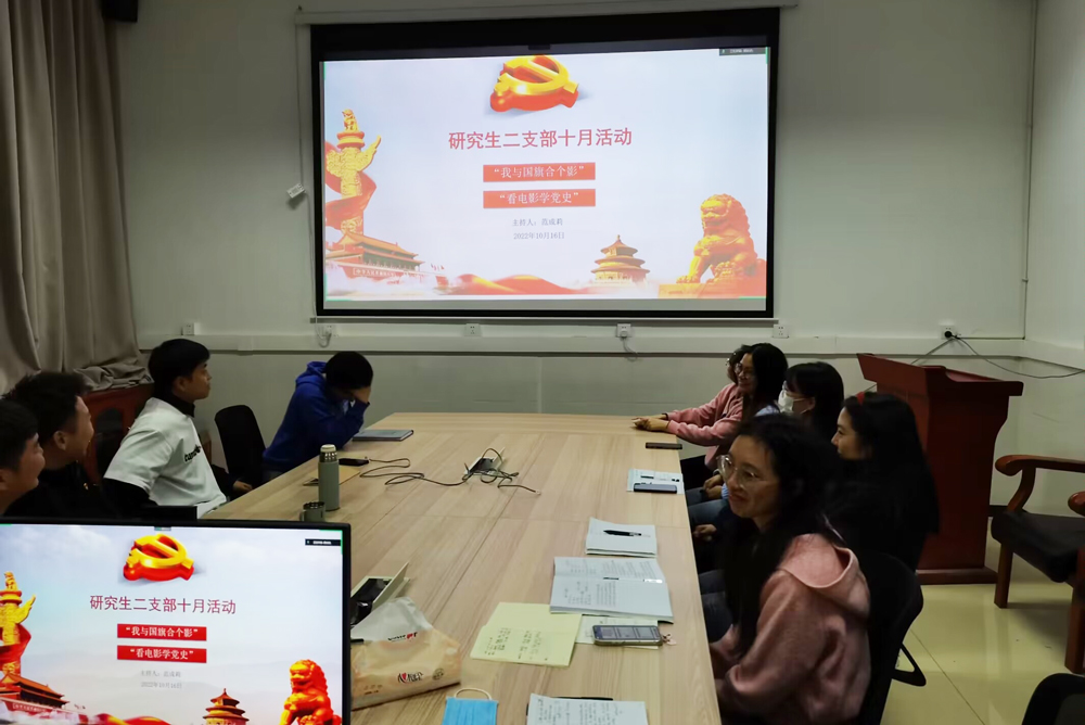 研究生二支部全体党员和入党积极分子通过线上+线下的方式,在37教118会议室开展了以“学习领悟党的二十大精神,重温新时代党的历史任务”为主题的党日活动及“我和国旗合个影”“看电影学党史”支部特色活动。