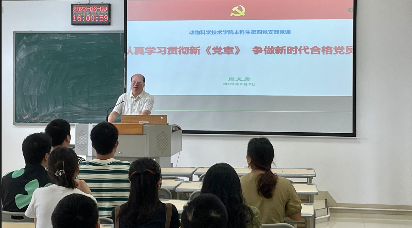 周克勇为支部成员讲授“认真学习贯彻新《党章》 争做新时代合格党员”专题党课。他详细介绍了党的二十大对党章修订的九个要点内容并提出新时代青年应该从坚定理想信念、自觉加强党性锻炼、在全面建成社会主义现代化强国的实践中建功立业、做全心全意为人民服务的模范、积极参加党组织活动五个方面答好“争做新时代合格党员,新时代青年应该怎么做”这一青春答卷。他对同学们表示殷切期望,鼓励大家努力学习、积极向上,争做“六有”新动科人才。