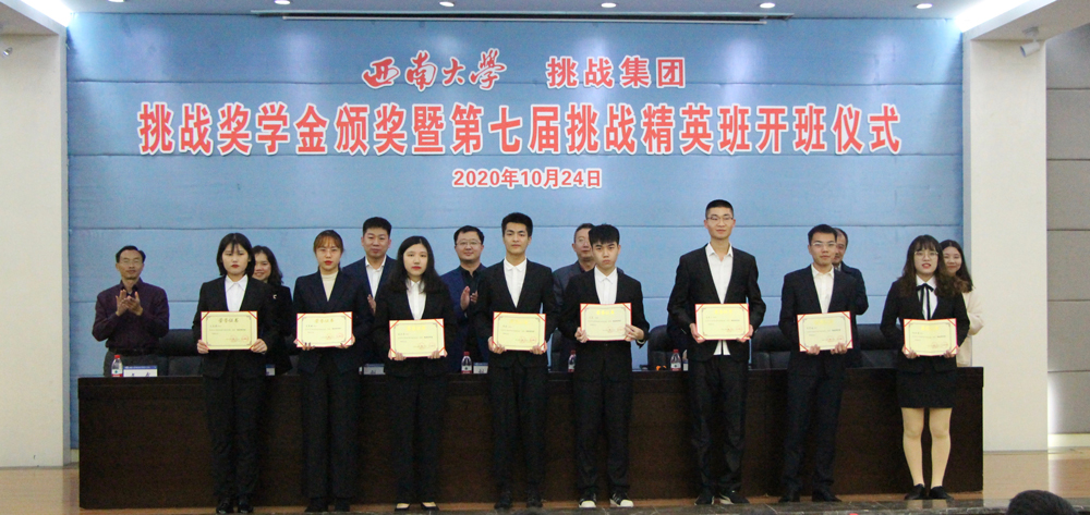 仪式开始,挑战集团副总裁刘世杰博士宣读了2019-2020年“挑战奖学金”的获奖名单,共有杨雨晴等8名本科生、严易等4名研究生以及第六届“挑战精英班”的3名成员获奖。紧接着,在主席台就座的领导、嘉宾为获奖同学颁发了获奖证书并合影留念。