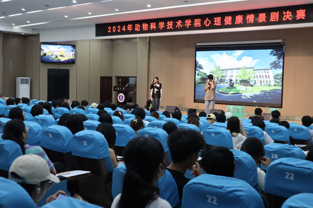 经过前期初赛筛选,共有九支参赛队入围决赛。九支参赛队伍将大学生成长路途中的心理困惑、发展过程以及应对方式等用舞台表演的方式生动呈现出来,进而引导大学生关注自己的身心健康,达到科普宣传和自我疗愈的目的。比赛期间,各参赛队伍带来的精彩演出使得现场欢声笑语不断,气氛热络,同学们也从情景剧中领会到心理健康的重要性,学到了缓解心理压力的方式方法。比赛结束后,文武做了点评,对同学们的精彩表演给予积极肯定,强调了同学们自我调节和朋辈互助在心理健康工作中的重要性,希望同学们积极营造阳光心态,努力成长为德智体美劳全面发展的“六有”新动科人才。
