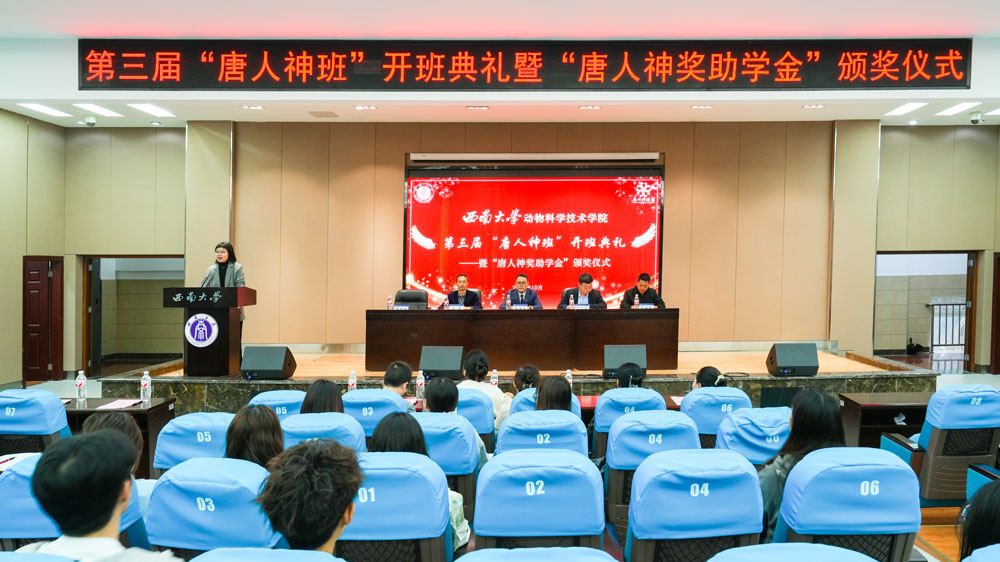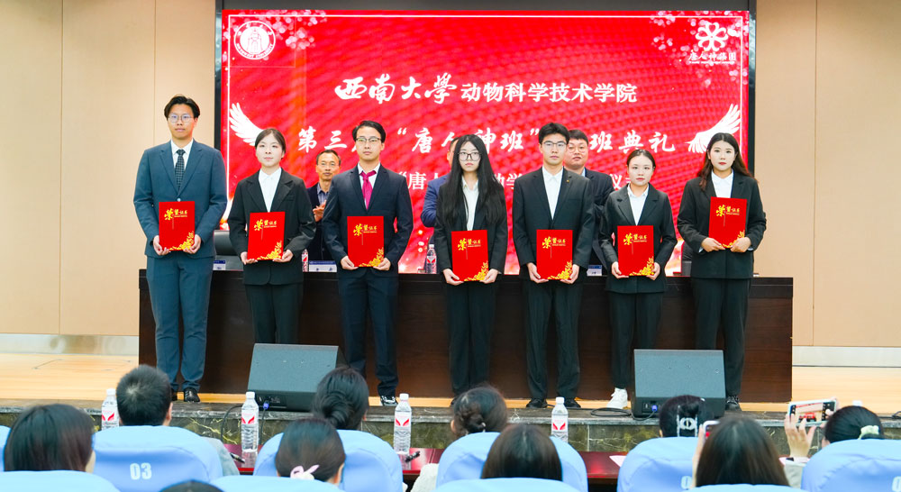 孙海军宣读第三届“唐人神班”学员名单,第三届“唐人神班”学员代表常真珍在发言中表示要传承和发扬“敬业、自责、自信、创新”的唐人神精神,坚定爱农、知农、学农的信心和决心,不断成长为“六有”现代畜牧科技人才。随后,刘金伟宣读“2023-2024学年唐人神奖助学金”获奖名单,主席台就座的嘉宾、领导为获奖学生颁发获奖证书。“唐人神”奖助学金获奖代表杨智代表全体获奖同学郑重承诺,将珍惜这份荣誉,以实际行动回报唐人神集团与正妹AV