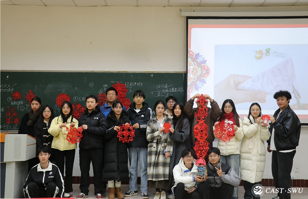 紧张而有趣的剪纸知识竞赛拉开活动序幕,竞赛内容涵盖了剪纸的历史、流派、代表作品等多个方面,研究生们积极参与,迅速抢答,现场气氛热烈,掌声不断。随后,现场同学随机分组,纷纷拿起剪刀和红纸,亲自尝试将脑海中的创意转化为手中的剪纸作品。从最初的生疏到后来的熟练,每一次剪裁都伴随着同学们的用情用心,每一幅作品都承载着同学们的创意巧思,展示了同学们的想象力与动手能力。
