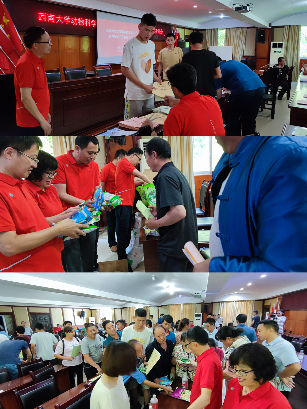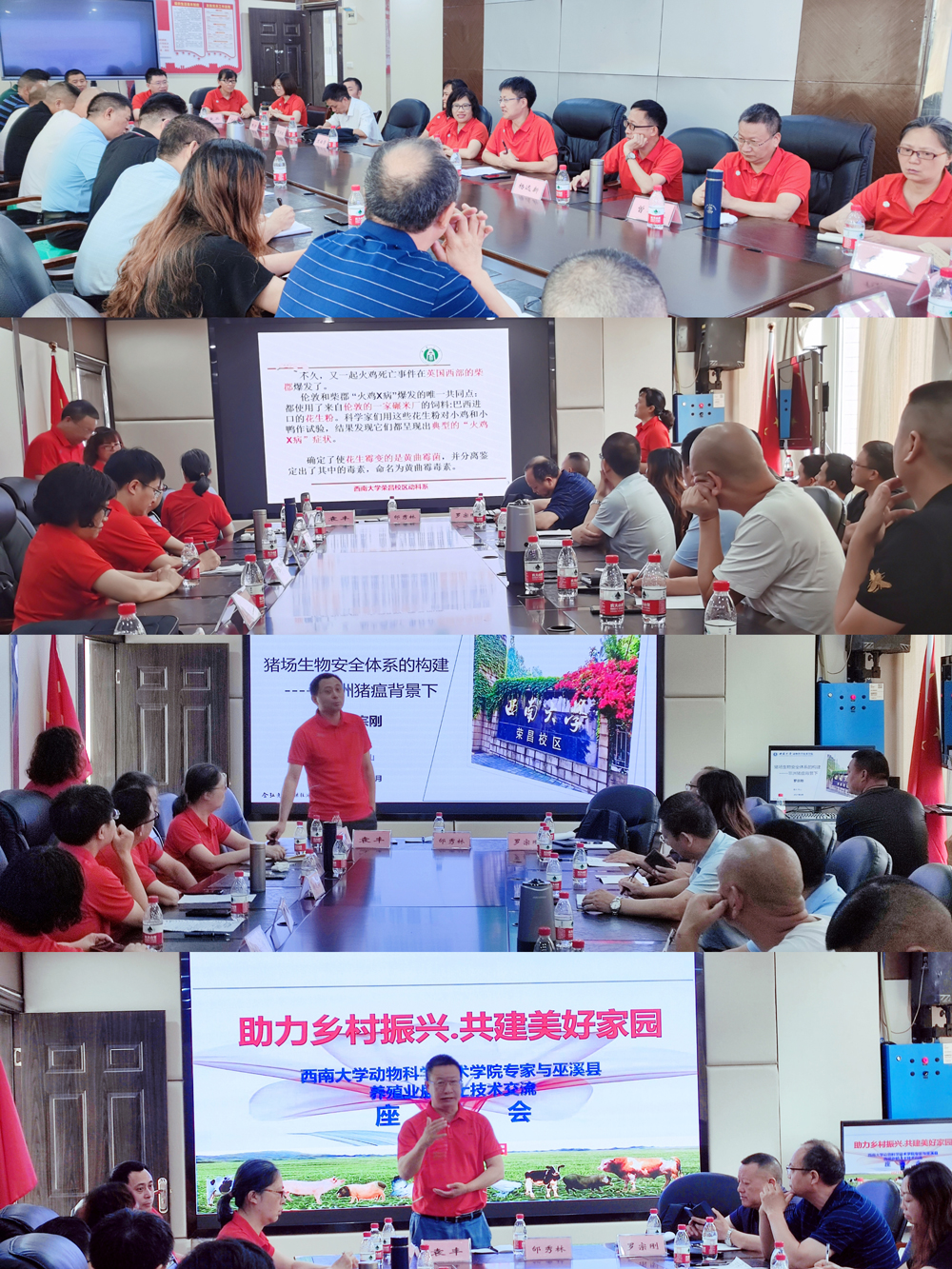 党委书记赵智华带领由党员专家团队等组成的15名教职工暑期志愿者“三下乡”服务队先后赴重庆市巫溪县和城口县修齐镇、咸宜镇李坪村开展“三下乡”活动。活动期间,服务队先后到巫溪县陆旺养殖有限公司和重庆腾展家禽有限公司进行实地走访,了解企业生产经营中遇到的困难和问题并进行现场指导,并先后听取了重庆市巫溪县农业农村委和城口县修齐镇、咸宜镇李坪村相关领导、养殖企业(户)的科技需求及乡村振兴中遇到的问题困难。针对大家提出的问题,服务队老师们以专题授课的形式做了养殖技术、营养与饲料、疾病防控等方面的培训,并通过现场答疑解惑的方式解决了许多困扰当地养殖企业的技术难题,与养殖企业(户)建立了线上联系机制,以便他们遇到困难时能够及时得到帮助。服务队还为养殖企业(户)现场免费发放了200余份《助力乡村振兴科技下乡养殖技术资料》和3000余元由重庆大农科技集团有限公司、重庆西农大科信动物药业有限公司、同连生物科技集团和重庆新动生物技术有限公司等企业赞助的乳猪用奶宝60份、乳猪抗痢产品40份、牛羊肥40份、益生菌添加剂100包,并为他们详细讲解了这些畜禽养殖用品及常用药品的使用方法。
