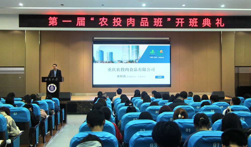 在荣昌校区2211报告厅举行第一届“农投肉品班”开班典礼暨校园招聘宣讲。重庆农投肉食品有限公司党委副书记熊世鸿、副总经理陈华云、科创中心主任余群莲、组织人事部部长王倩、人力资源部招聘专员樊勤英,正妹AV