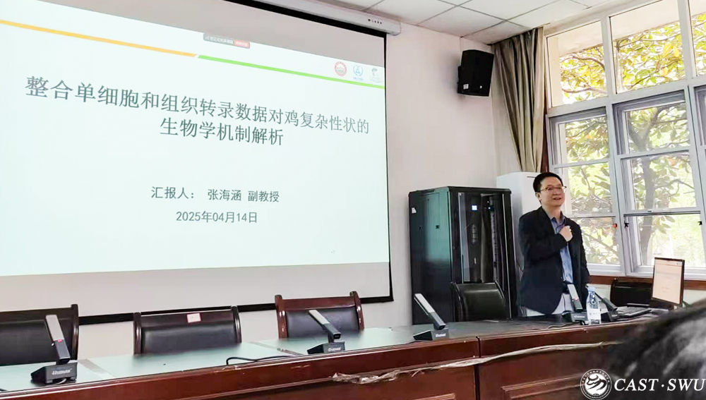 张海涵副教授作“整合单细胞和组织转录数据对鸡复杂性状的生物学机制解析”的报告,他对鸡盲肠单细胞图谱构建及对艾美尔球虫感染宿主的机制挖掘和鸡不同性别脂肪组织单细胞图谱构建与性别差异的脂肪沉积规律进行了详细的介绍。