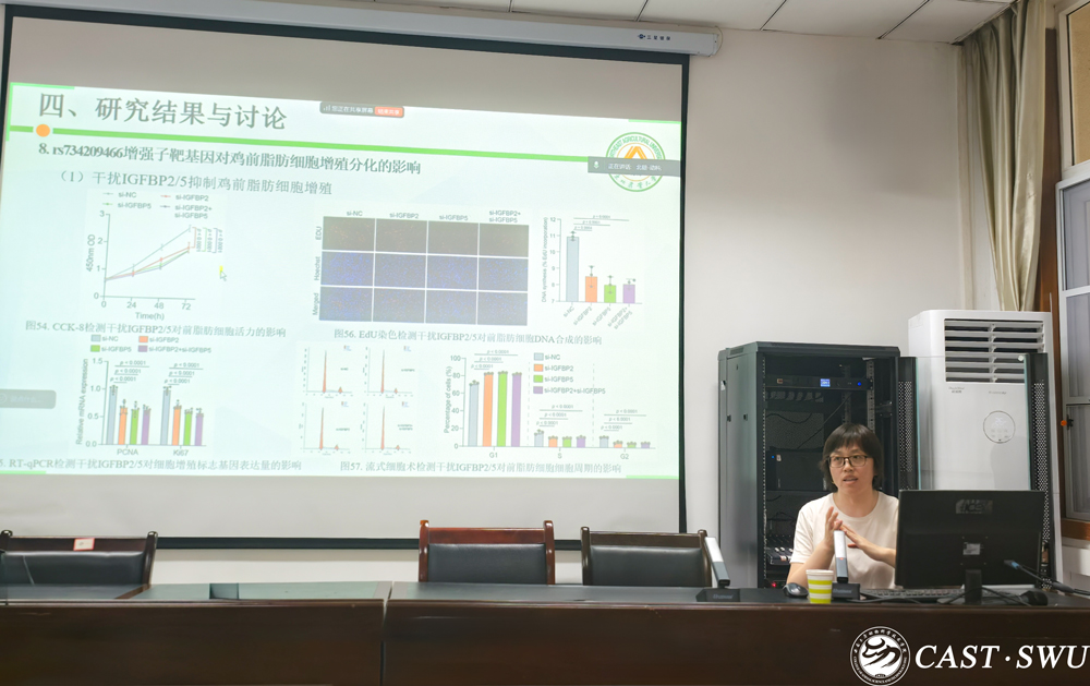 报告中,张慧教授以多组学数据整合为切入点,通过构建完整的三维染色质调控网络图,精准鉴定出众多功能性变异位点及靶基因,系统揭示了肉鸡腹脂沉积的分子调控路径。其研究以跨学科融合的方法论,层层剖析遗传信息与代谢表型的关联机制,为禽类育种领域提供了全新的研究范式。在交流环节,张慧教授结合自身丰富的科研经验,深入浅出地分享了前沿技术在家禽遗传中的创新应用。同时结合农业农村部鸡遗传育种重点实验室的最新成果,张慧教授与师生就多组学数据的整合技术瓶颈、功能位点验证等问题展开热烈讨论,现场学术氛围浓厚。