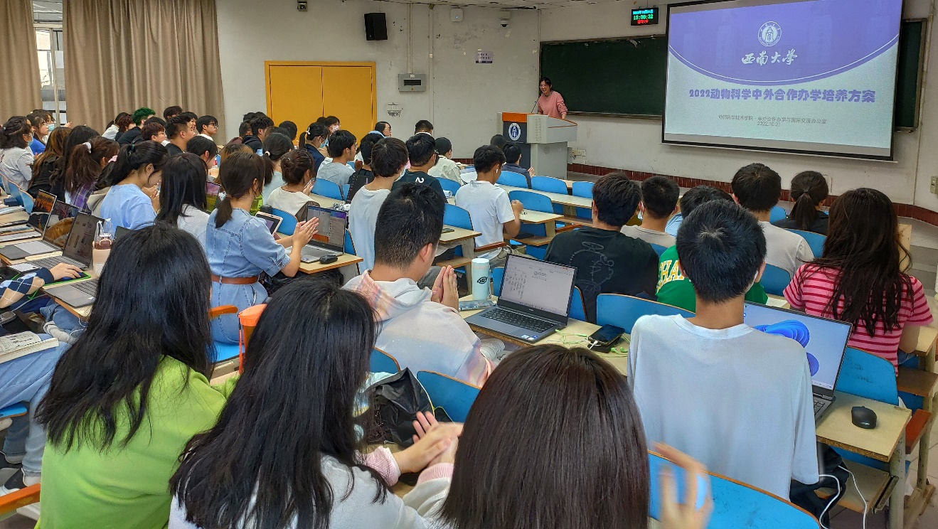 介绍会上杨游老师根据动物科学专业特色详细为新生介绍了中外合作办学培养方案;孙雅望老师结合自己的留学经历讲解了动物科学出国留学项目等内容。会后许多学生均表示出对动物科学中外合作办学的出国留学项目有浓厚的兴趣,同时杨游、孙雅望等在场老师均为同学提出的学费、申请2+2和3+2的条件等问题进行了一一解答。