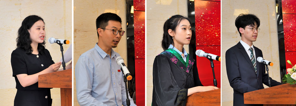校友代表刘博洋在发言中表达了对母校和老师的感恩之情,向即将毕业的同学们致以最热烈的祝贺,希望大家能勇敢地追求自己的梦想,始终保持学习的热情,突破自我,向上生长,成为更好的自己,不断为社会做出贡献,为母校争光。