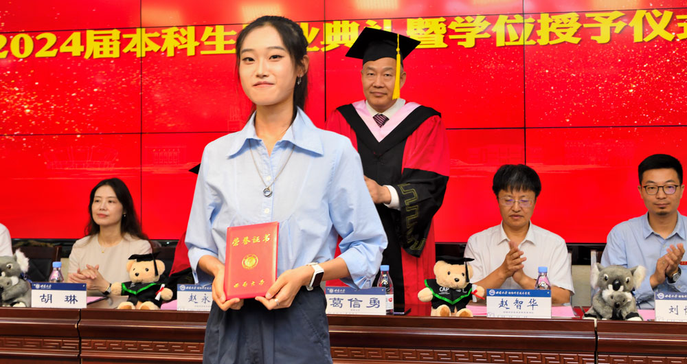 学术委员会委员为获得学士学位者颁发学位证书并授位。文武宣读2024届校友联络员名单及2021级赴澳大利亚詹姆斯∙库克大学深造的学生名单。