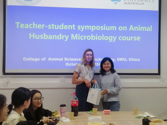 在交流环节,皮卡德博士与学生们就学习、生活、未来专业方向选择以及职业规划等话题进行了深入的讨论。在场的十几名学生表现出了极高的热情,他们围绕畜牧微生物专业,以及学习、科研、生活等方面提出了许多问题。此外,皮卡德博士还分享了她个人的一些生活趣事,包括她对橡皮艇的爱好,以及她每天单程12公里骑自行车的日常生活。作为一位经验丰富的兽医,她在南非、澳大利亚都有丰富的野外和农场工作经验,治疗过的动物种类繁多,包括考拉、海龟、猎豹、牛羊马等。学生们围绕畜牧微生物专业课程,积极听取皮卡德博士的回馈,并就动物健康养殖等话题进行了深入的探讨。