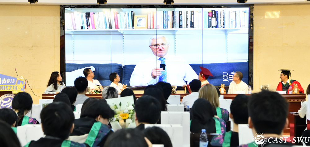 远在澳大利亚的詹姆斯∙库克大学副校长Marcus Lane作视频寄语,表达了对毕业生的美好祝福,希望两校能继续深入合作、共促发展。