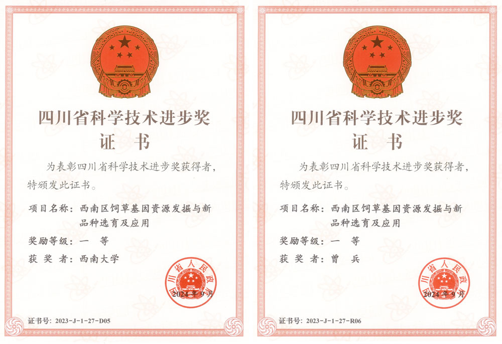 曾兵教授主研参与完成的“西南区饲草基因资源发掘与新品种选育及应用”成果获得四川省科技进步一等奖。